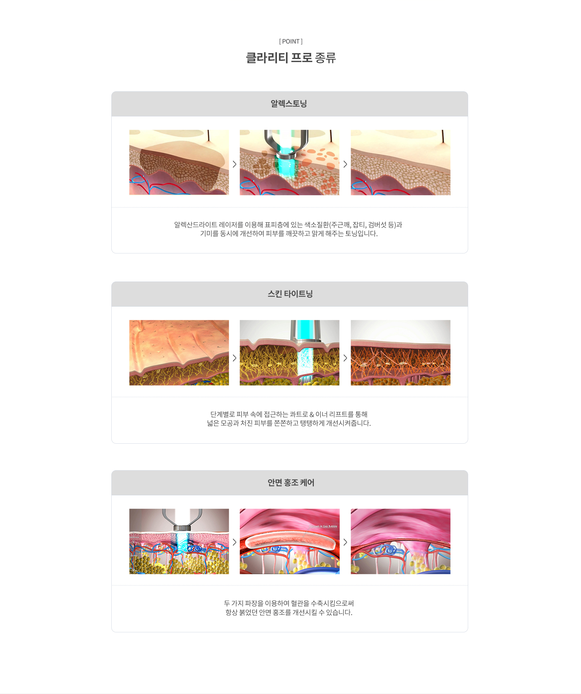 클라리티 프로는 두 가지 파장(755nm, 1064nm)을 사용하는 프리미엄 레이저 장비로, 피부 상태에 맞춰 3단계 맞춤 시술이 가능합니다. 1단계: 멜라닌 색소, 잔털, 피부톤 개선 2단계: 홍조, 확장된 모세혈관, 혈관성 잡티 개선 3단계: 탄력 개선, 모공 축소, 피부결 개선 즉, 단일 시술로 붉은기와 혈관 개선은 물론, 피부톤 효과까지 함께 기대할 수 있는 시술입니다.