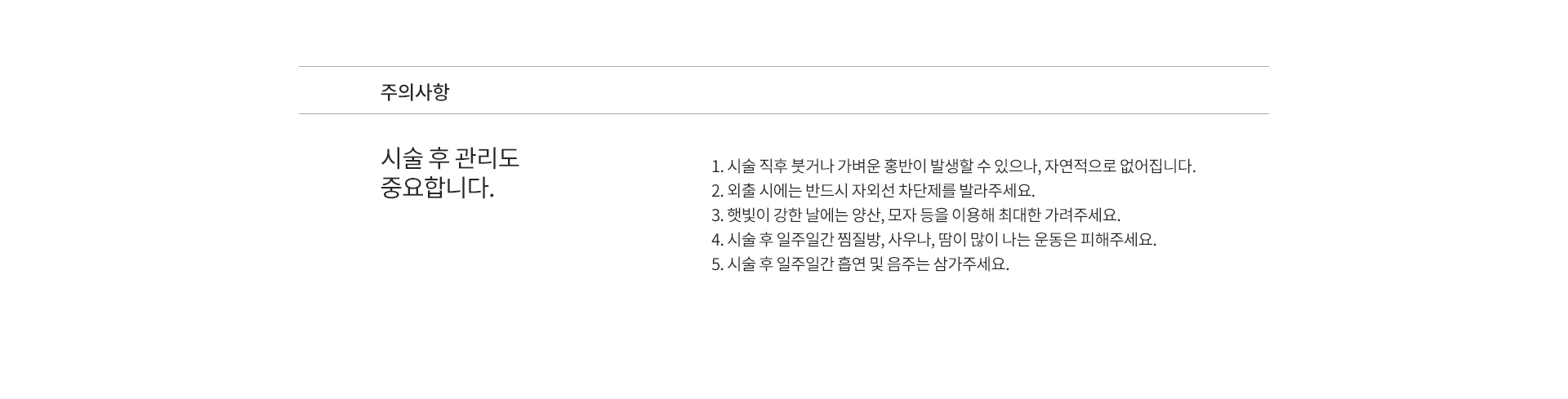 시술 강도나 피부 상태에 따라 딱지, 가려움, 두드러기 등이 일시적으로 생길 수 있으며, 이는 자연스러운 회복 과정입니다. 딱지는 억지로 뜯지 말고 자연스럽게 떨어지도록 두시는 것이 좋습니다. 단, 가려움이나 두드러기의 정도가 점점 심해지거나, 일상생활에 불편함이 느껴진다면 카카오톡 채널로 문의 부탁드립니다. 또한 시술 후 피부 당김이나 건조함이 느껴질 수 있으므로, 보습크림이나 재생크림을 충분히 발라주는 것이 피부 회복에 도움이 됩니다.