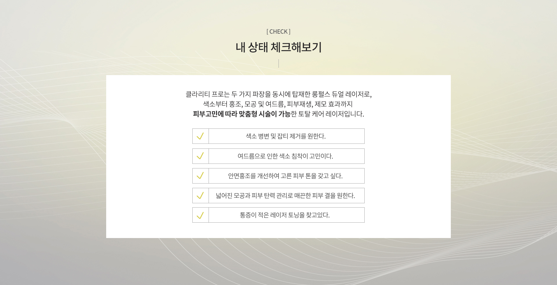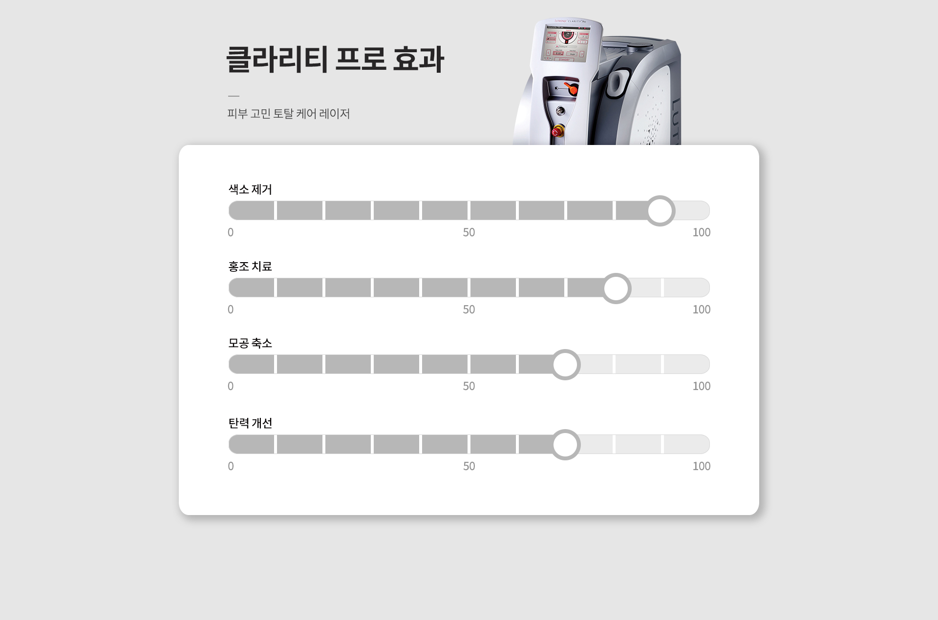 클라리티 프로는 이중 파장을 탑재한 롱펄스 듀얼 레이저로 피부 고민 별 맞춤형 시술이 가능한 토탈 케어 레이저입니다.